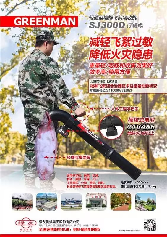 綠友集團創(chuàng)新研發(fā)的SJ300D輕便型楊柳飛絮吸收機,可精準(zhǔn)捕捉飛絮,而對落葉雜物無犯,具有重量輕,吸取和收集效果好,效率高,使用方便等特點。本產(chǎn)品適用于學(xué)校、醫(yī)院、機場、物業(yè)、庭院、車庫、工廠、工業(yè)園區(qū)、公園、景區(qū)等楊柳飛絮散落或聚集區(qū)域的收集使用。