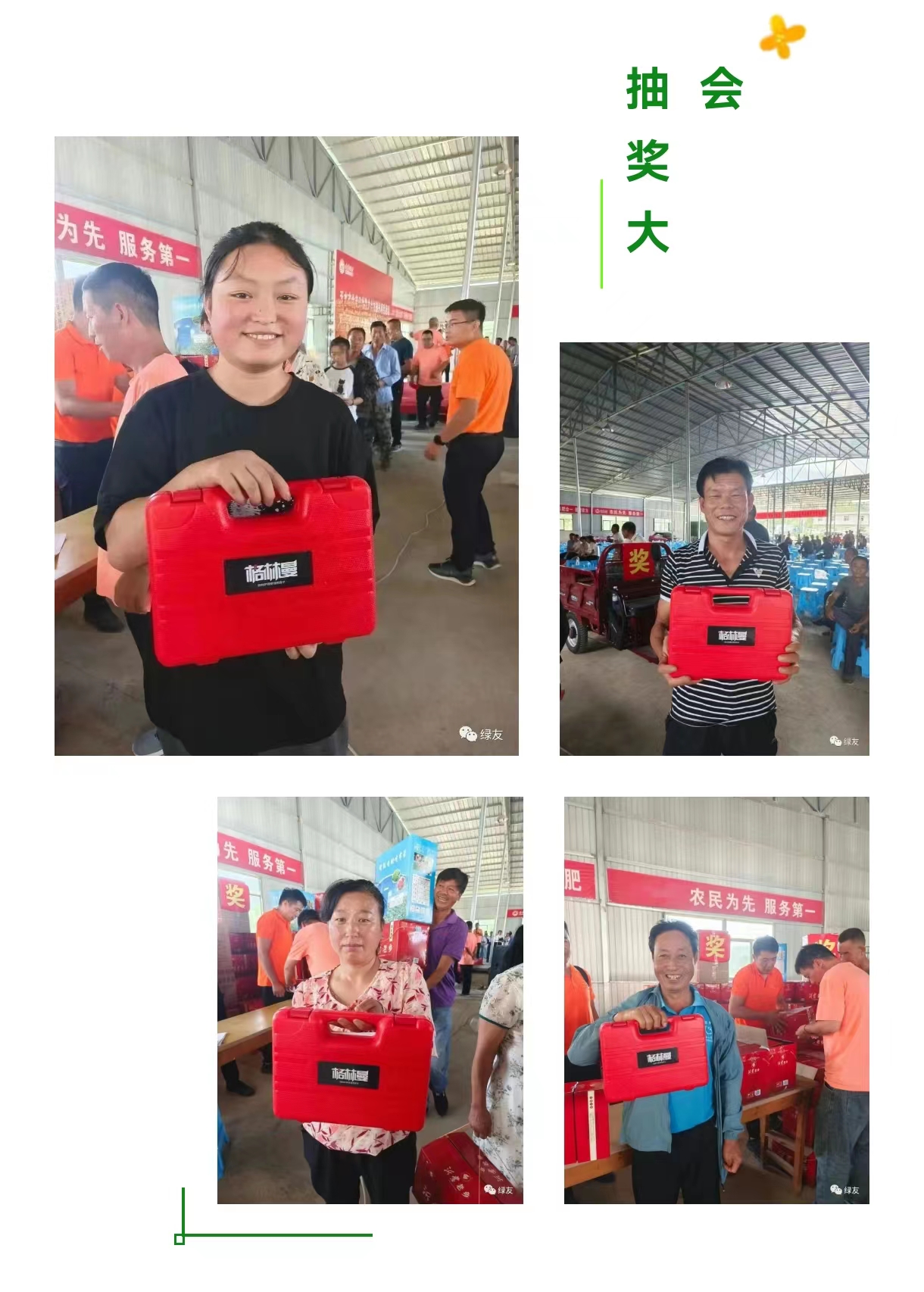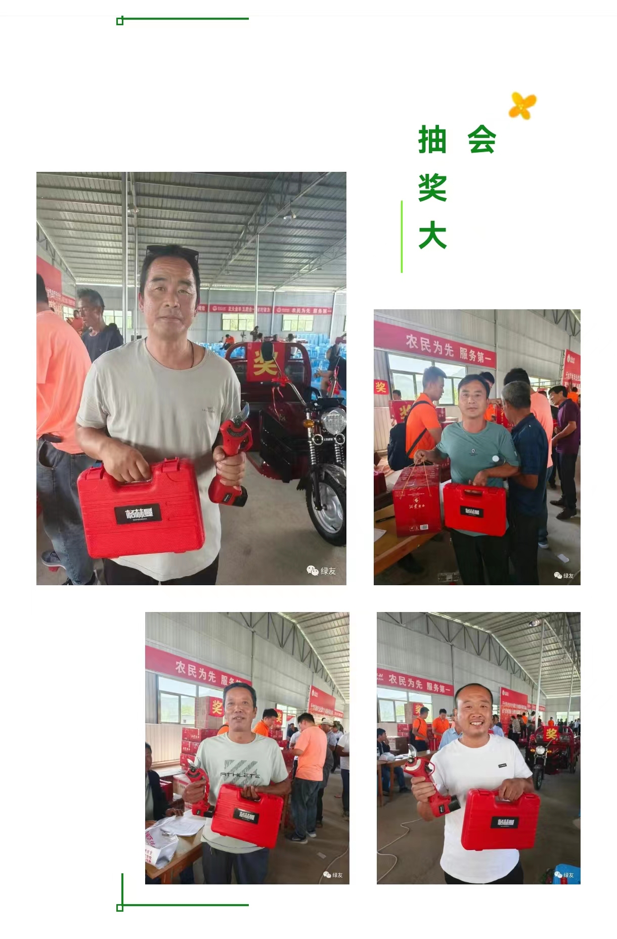 西安綠友園林機械有限公司寶雞分公司攜手某公社分別于8月24日和9月3日舉辦助力鄉村振興項目千人抽獎大會。每場次參會人員均達千余人,綠友公司的格林曼電動修枝剪作為獎品,廣受農戶好評。