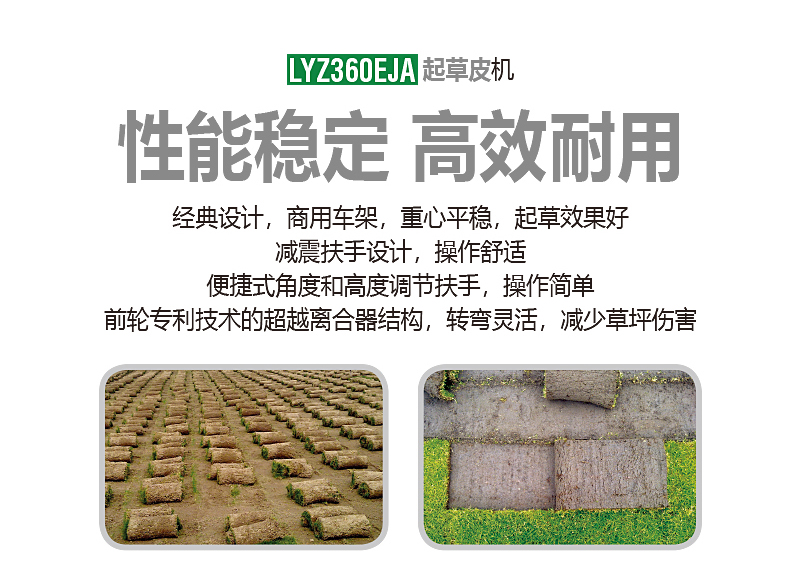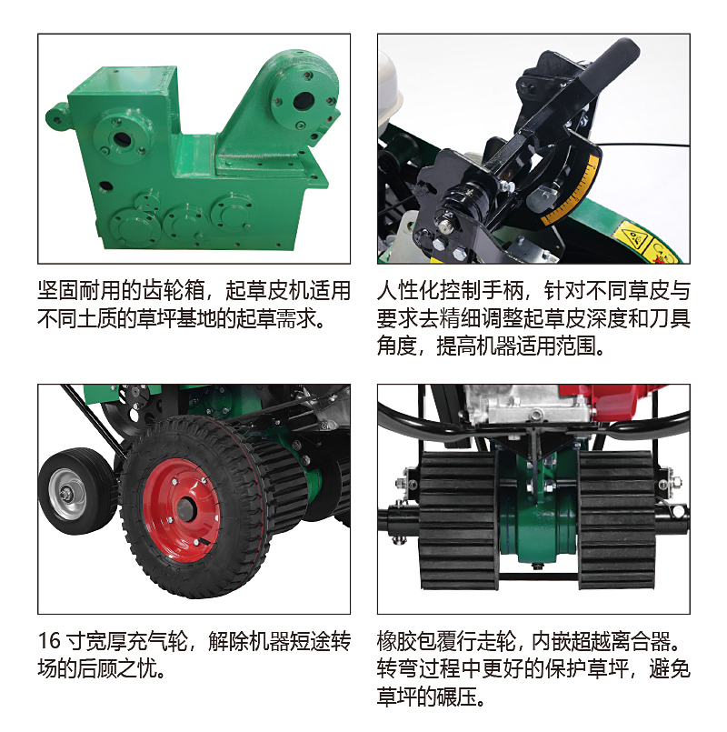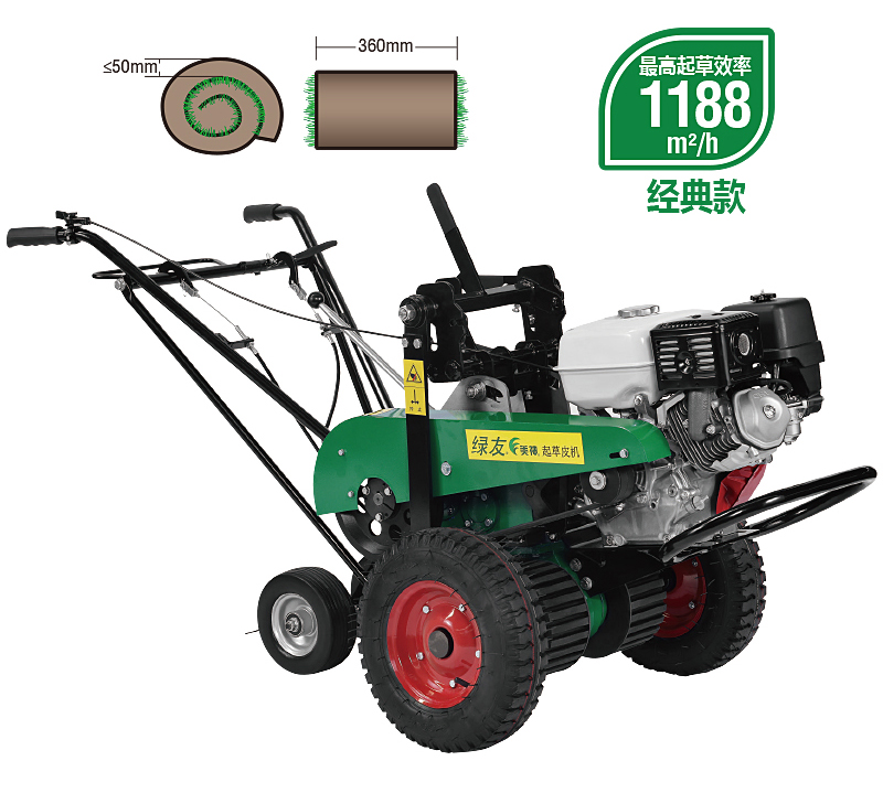 美神起草皮機根據人體工程學原理,改進了操作方式,扶手增加減震,后輪為萬向輪并配有超越離合器,轉彎方便且不損壞草坪,增加了操作者舒適度。本產品可根據不同草種和不同狀態草皮隨意調整起草的深度、角度,效率高。